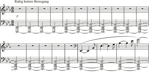 Am Anfang war der Klang: ein oktaviertes Es in den Kontrabässen, ausgehalten in einem kaum hörbaren Grollen. Ab dem fünften Takt kommen die Fagotte mit einem zweifachen B dazu, fünf Töne höher. Zusammen bilden diese Töne das Intervall einer reinen Quinte – wie die Quinte am Beginn von Beethovens Neunter Symphonie ist sie Ausdruck urtümlicher Natur, das Geräusch des Kosmos im Ruhezustand. Dann folgen nacheinander acht Hörner in einer Aufwärtsbewegung – die natürliche Obertonreihe, wie sie von einer schwingenden Saite erzeugt wird. Weitere Instrumente kommen dazu, allmählich beschleunigt sich der Puls. Während sich die Klangmasse sammelt, in der Luft wirbelt und wogt, bleibt die grundlegende Tonalität von Es-Dur erhalten. Erst nach hundertsechsunddreißig Takten – nach vier bis fünf Minuten – ändert sich die Harmonie, sie wird zu As-Dur. Die anhaltende Stasis schafft ein neues Zeitgefühl, auch wenn nur schwer zu erklären ist, um welche Art von Zeit es sich handelt: Vielleicht ist es ein Augenblick in Zeitlupe, oder es sind ganze Zeitalter, die nur verschwommen wahrgenommen werden.