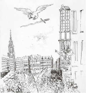 Der Aufstand in Dresden von 1849: Die Sopranistin Wilhelmine Schröder-Devrient am Fenster ermahnt die Menge.