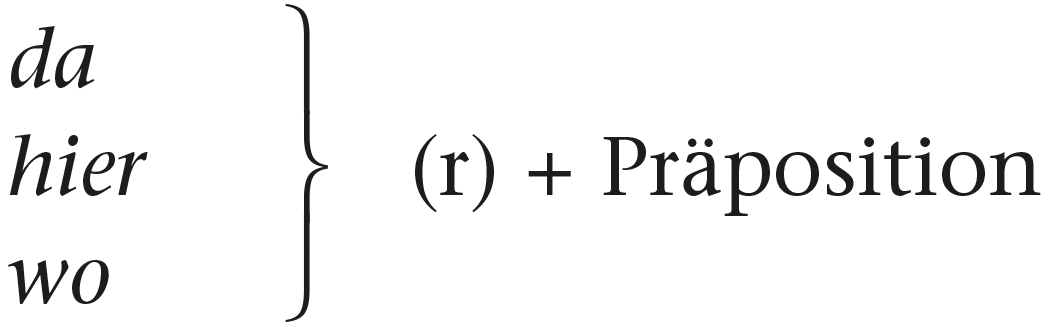 Als PronominaladverbienPronominaladverb werden solche Adverbien bezeichnet, die – ähnlich wie Pronomen – stellvertretend für andere, vollsemantische Elemente stehen. Im Gegensatz zu Pronomen sind die Pronominaladverbien unflektierbar. Sie werden gebildet aus den Adverbien da, hier und wo und einer Präposition: