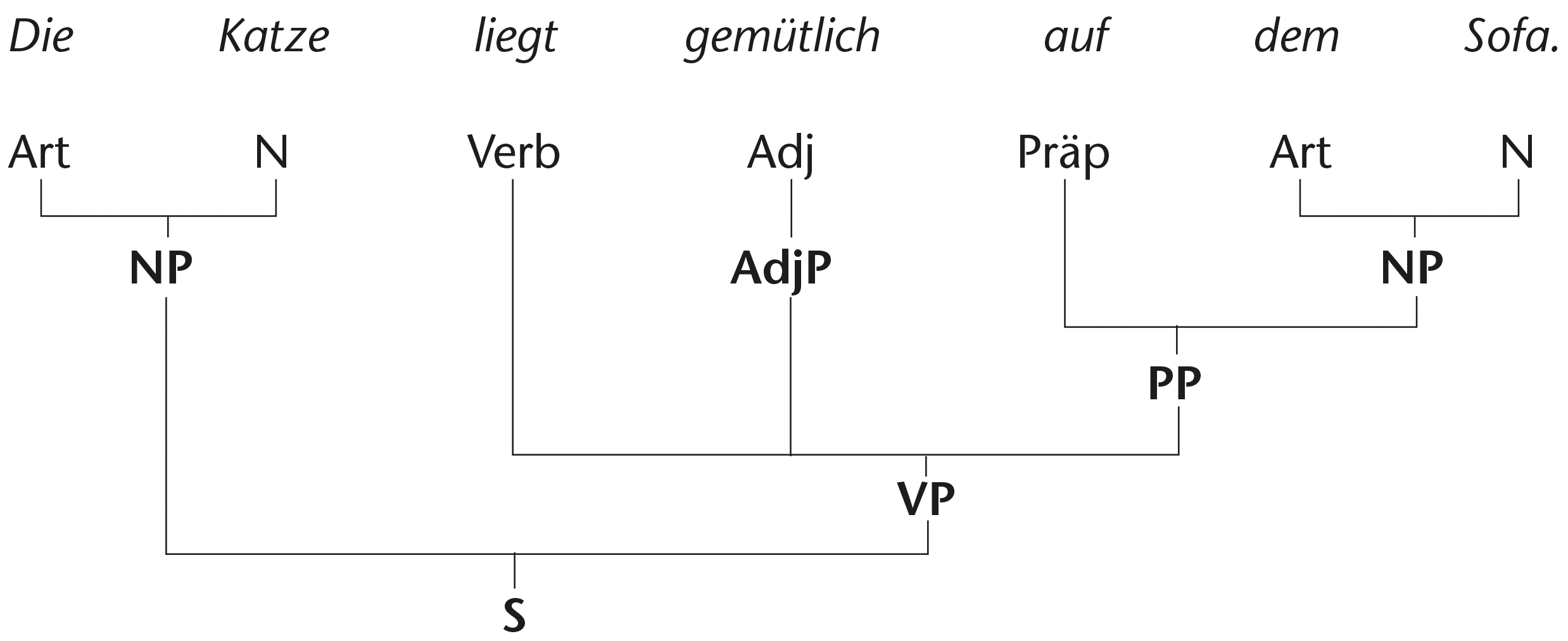 (21) | S[ NP[Die Katze] VP[liegt AdjP[gemütlich] PP [auf NP [dem Sofa]]]]. |