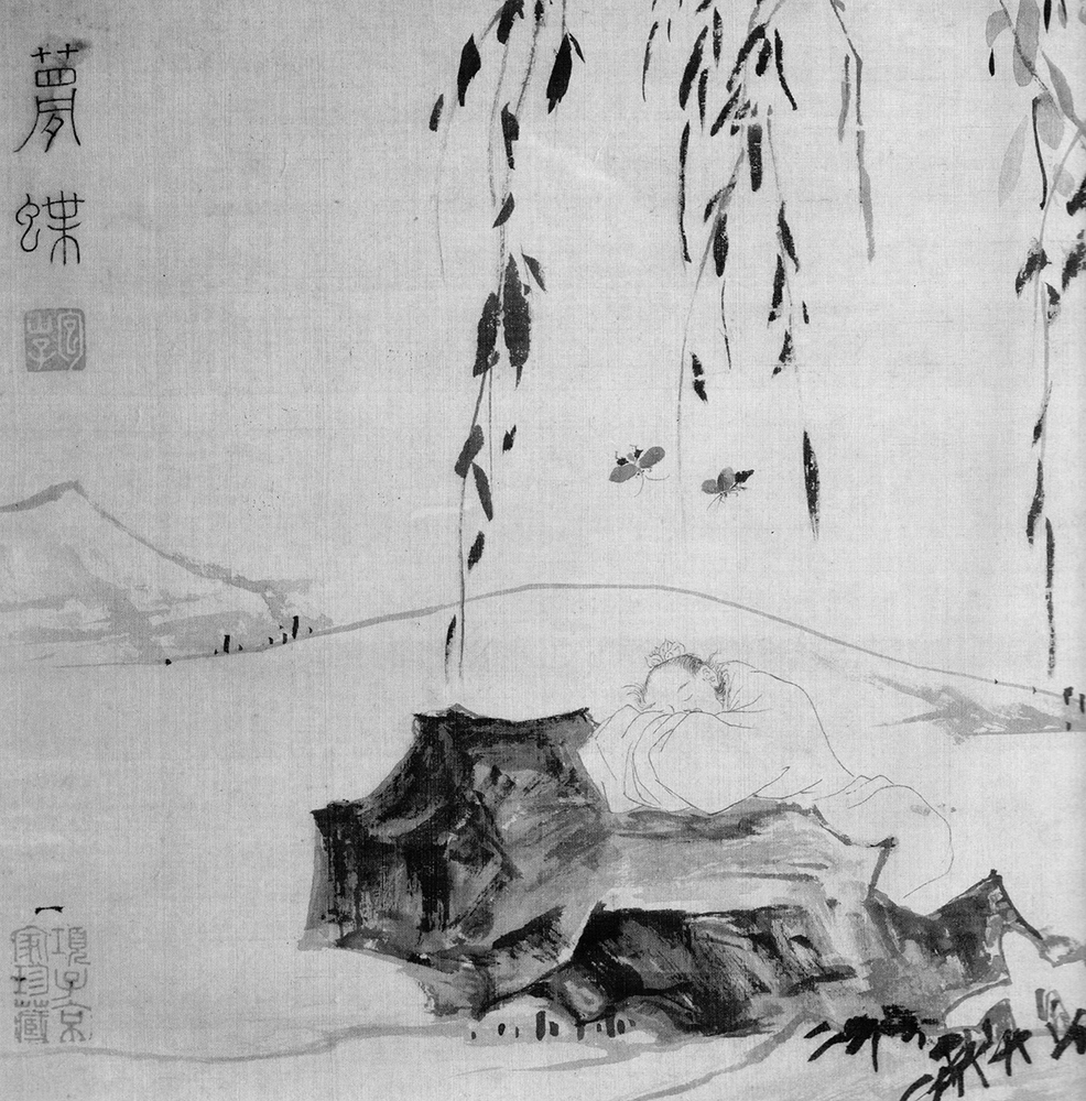 Einst träumte Zhuang Zhou, ein Schmetterling zu sein, ein lebhaft flatternder Schmetterling, glücklich mit sich selbst, nur seinem Willen folgend. Er wusste nicht, dass er Zhuang Zhou war. Wie freute er sich, als er kurz darauf erwachte und feststellte: »Da ist Zhuang Zhou!« Doch er wusste nicht, war er Zhuang Zhou, der geträumt hatte, ein Schmetterling zu sein, oder war er ein Schmetterling, der geträumt hatte, Zhuang Zhou zu sein? Zwischen Zhuang Zhou und dem Schmetterling muss es doch einen Unterschied geben! Das ist damit gemeint, dass sich die Lebewesen wandeln.