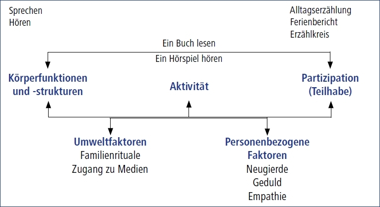 Anderen Menschen aus seinem Leben zu erzählen und von ihren Erlebnissen zu hören, ist in unserer Gesellschaft von hoher Bedeutung. Sich mit anderen Menschen auszutauschen, ist damit nicht nur wichtig für das eigene Wohlbefinden, sondern auch für die soziale Teilhabe (Partizipation). Die Teilhabe stellt nach der Internationalen Klassifikation der Funktionsfähigkeit, Behinderung und Gesundheit bei Kindern und Jugendlichen (ICF-CY) ein elementares Ziel dar. Im ICF-Modell können unterschiedliche Einflussbereiche miteinander in Beziehung gesetzt werden. Dazu gehören neben den körperlichen Voraussetzungen eines Kindes (Körperfunktionen und -strukturen) auch konkrete Alltagshandlungen (Aktivitäten) und das Eingebundensein in das Umfeld (Teilhabe). Diese einzelnen Komponenten interagieren miteinander und beeinflussen sich somit gegenseitig. Diese Wechselbeziehung wird in Abbildung 1 anhand von Beispielen aus dem kindlichen Alltag dargestellt.