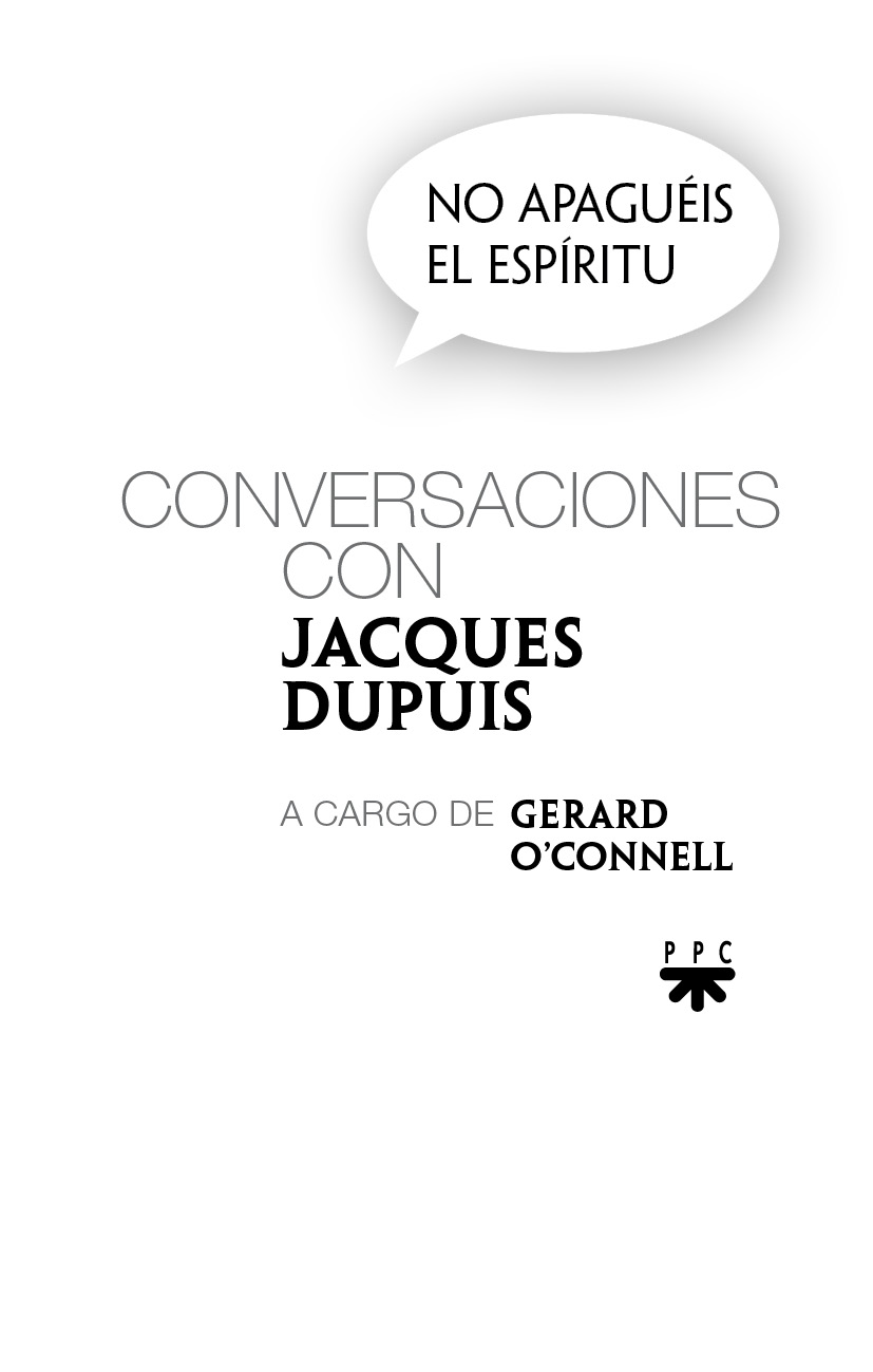 El libro fue idea mía, pero Dupuis le puso el título: No apaguéis el Espíritu. Él también insistía en añadirle tres artículos y tres apéndices al libro-entrevista, para ofrecer una más completa y profunda elaboración de algunos puntos cruciales planteados por él en nuestras conversaciones. Dos de ellos, sin embargo, han sido publicados ya en otros lugares (como se puede ver en la nota editorial de este libro un poco más adelante) y, por tanto, no han sido incluidos aquí. El tercero, «La teología del pluralismo religioso, revisada», es el capítulo 4, puesto que es el único que no ha sido publicado aún. En él, Dupuis resalta los puntos principales en los que siente necesario aclarar o matizar su posición a la luz del debate surgido tras sus dos libros.