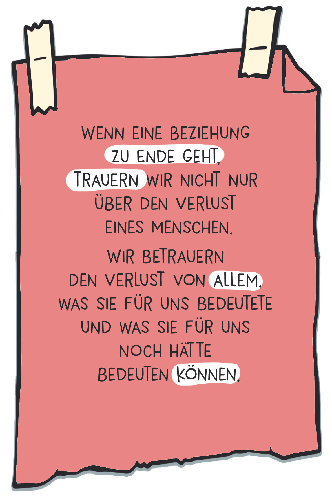 Partnerschaften bedeuten Sicherheit, Lebendigkeit und Zukunftsperspektive. Wenn wir eine Beziehung eingehen, malen wir uns aus, wie es wohl wäre, sich auf diese Person vollständig einzulassen. Wenn eine Beziehung endet, trauern wir deshalb um mehr als nur um den Verlust einer Person; wir trauern darum, was diese Partnerschaft für uns bedeutet hat und was aus ihr hätte werden können. Darum seien Sie in solchen Zeiten besonders milde mit sich selbst.
