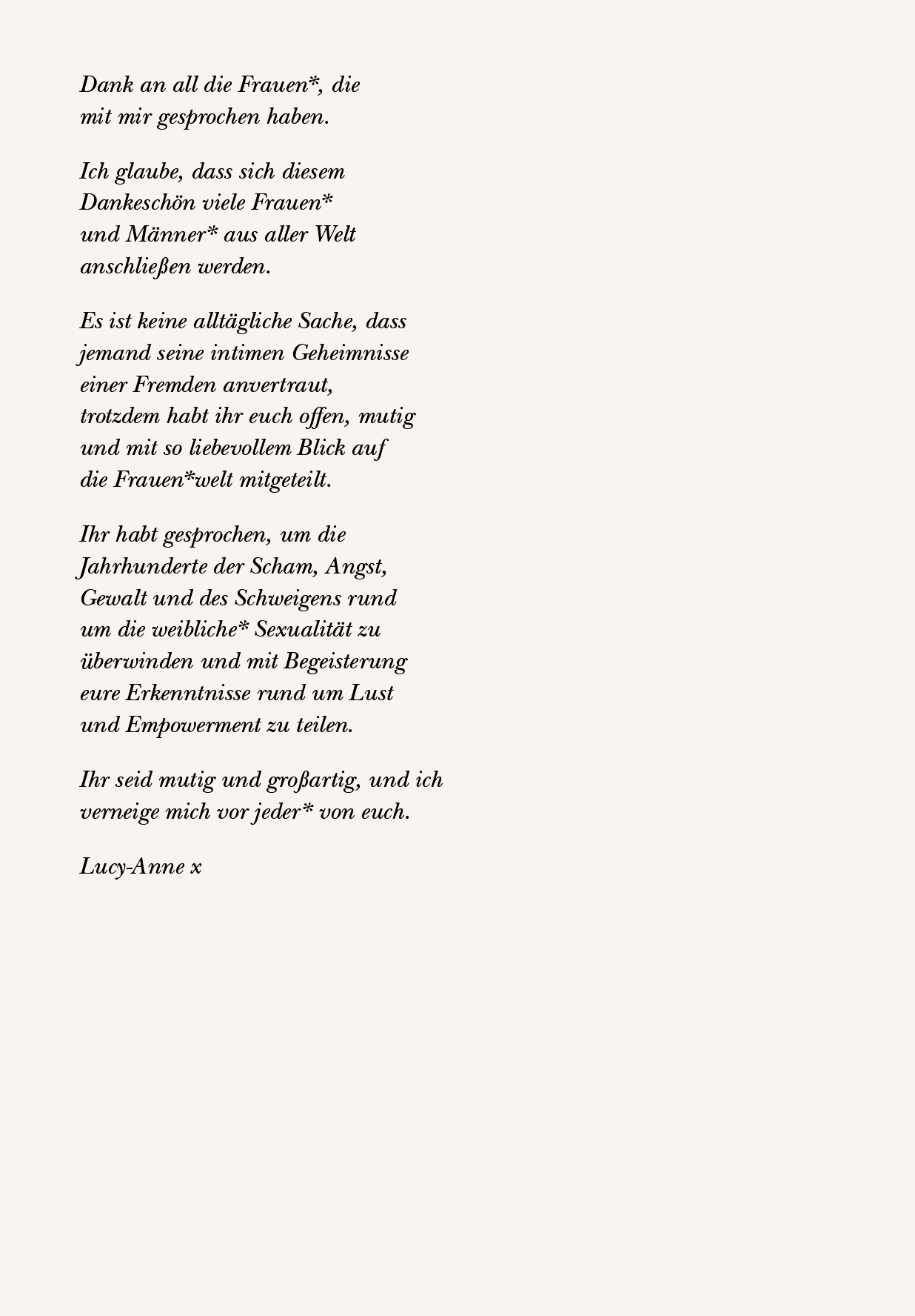 Was denken Frauen* über Sex? Was erfüllt sie? Was hätten sie lieber nicht erlebt? 51 Frauen* stehen Rede und Antwort, Frauen* jeden Alters, aus allen Teilen der Welt und allen gesellschaftlichen Schichten. Neben heterosexuellen, bisexuellen und lesbischen Frauen kommen pansexuelle und trans Frauen zu Wort ebenso wie nicht-binäre Menschen. Sie erzählen von Selbstachtung, Scham und Schmerz, Body Positivity, Lust und Tabus. Entstanden ist ein einzigartiges Dokument von sexueller Selbstentdeckung und dem sich wandelnden Verständnis von Sexualität. Innovative Künstler*innen runden die Texte mit ihren Illustrationen auf ganz besondere Weise ab.