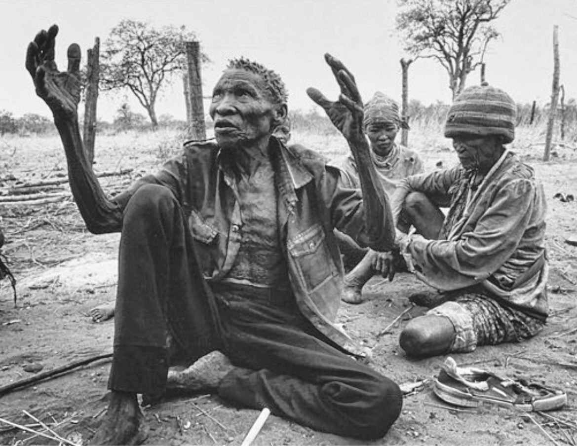 Unterdessen dämmert es, die glutrote riesige Sonnenscheibe versinkt im Busch. Sie setzt sich zum Essen auf die Erde, sagen die San. !Gubi kauert am Feuer und schmaucht eine Pfeife. Sein größter Wunsch? Er muss nicht lange überlegen. »Ein Platz, an dem wir in Frieden gelassen werden.«
