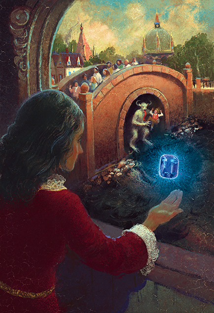 Dieses Mal, als die Kinder sich der Brücke näherten, war Margaretha bereit. Sobald der Dämon hochsprang, löste sie das Seil. Mit einem gewaltigen Platschen stürzte die Brosche in den Kanal. Doch schon dieser flüchtige Blick, den der Dämon auf sie erhaschte, reichte, um ihn verrückt zu machen vor Verlangen.