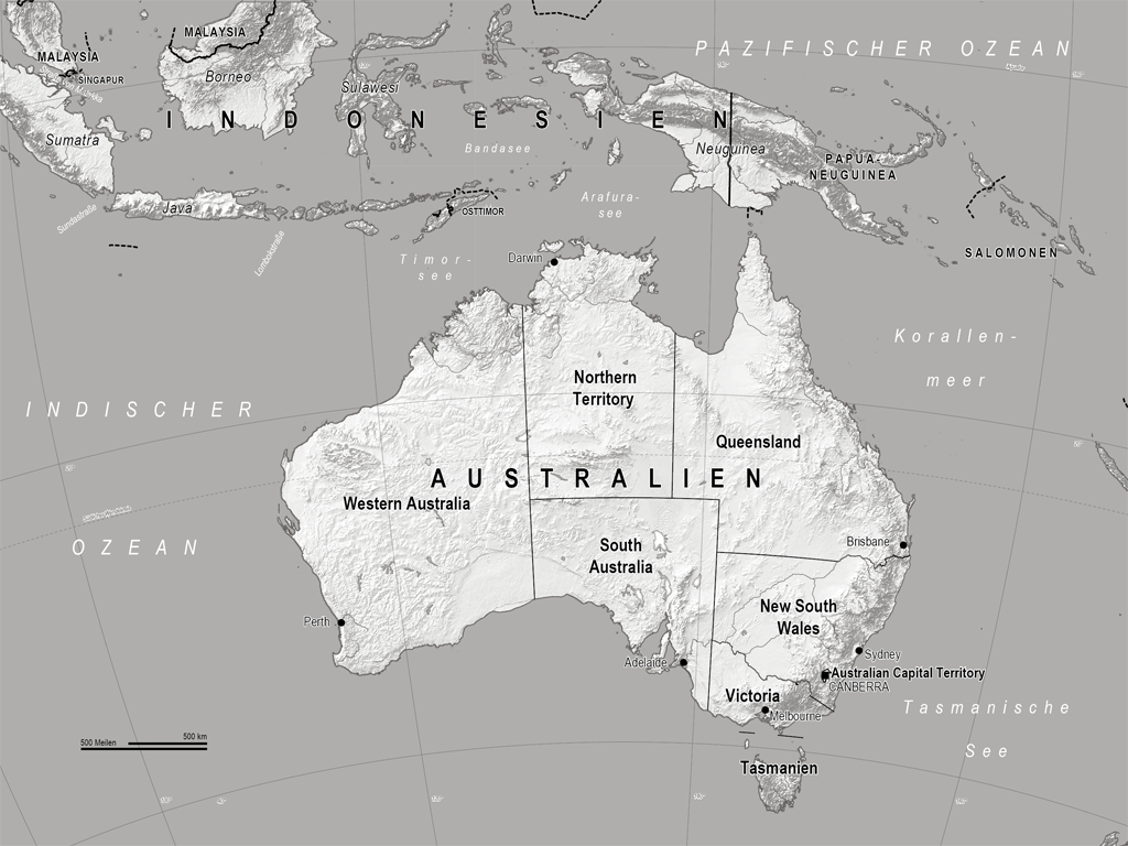 AustralienAustralien umfasst 7,7 Millionen Quadratkilometer und ist damit das sechstgrößte Land der Erde. Die Fläche verteilt sich im Wesentlichen auf sechs Bundesstaaten, der größte davon ist Western Australia, der ungefähr ein Drittel des Kontinents ausmacht und größer als ganz Westeuropa zusammen ist. Dann folgen der Größe nach: QueenslandQueensland, South AustraliaSouth Australia, New South WalesNew South Wales, VictoriaVictoria und die Insel TasmanienTasmanien. Es gibt außerdem noch mehrere Territorien, davon sind das Northern TerritoryNorthern Territory und das Australian Capital Territory die größten, es gehören aber auch die KokosinselnKokosinseln und die WeihnachtsinselWeihnachtsinsel dazu.