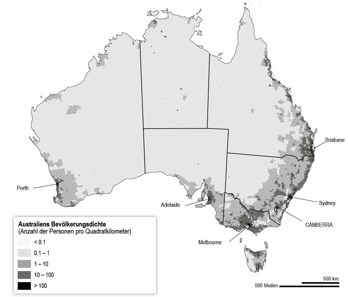 Das Innere Australiens ist weitgehend unbewohnbar; der größte Teil der australischen Bevölkerung lebt in einem Siedlungsstreifen entlang der Südostküste.