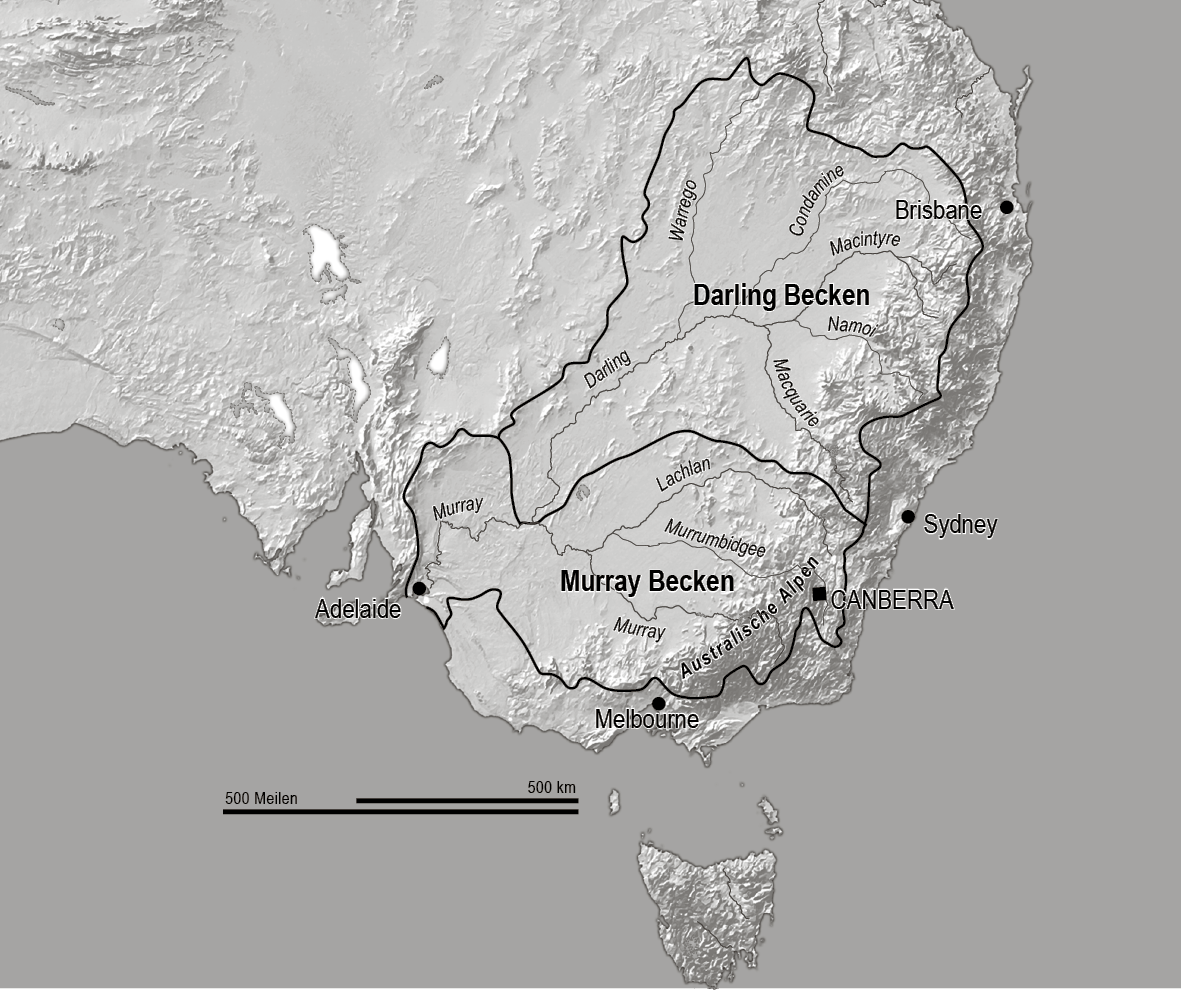 Thomas Griffith TaylorTaylor, Thomas Griffith, der erste Geographieprofessor an der Universität SydneySydney, löste vor hundert Jahren große Empörung aus, als er erklärte, die Bevölkerung Australiens werde bis zum Jahr 2000 nicht wesentlich über zwanzig Millionen anwachsen, weil die Topographie dies nicht zulasse. Er wagte es, den Australiern zu sagen, dass die Wüste nahezu unbrauchbar für eine dauerhafte Besiedlung sei, was man damals für sehr unpatriotisch hielt. Die Presse heulte, und die Politiker schimpften über den angeblichen »Umwelt-Determinismus«. Sie stellten sich eine konstante Expansion von einer Küste zur anderen wie in den USAUSA vor. Aber Professor Taylor hat recht behalten: Auch heute beträgt die australische Bevölkerung nicht mehr als 26 Millionen. Auch heute noch kann man die 3200 Kilometer von Sydney nach DarwinDarwin oder nach PerthPerth fliegen, ohne unterwegs eine andere Stadt zu sehen. Fast 50 Prozent der Bevölkerung leben in nur drei Städten: Sydney, MelbourneMelbourne und BrisbaneBrisbane. Es ist kein Zufall, dass sie alle in der Nähe des Murray-Darling-Beckens liegen.