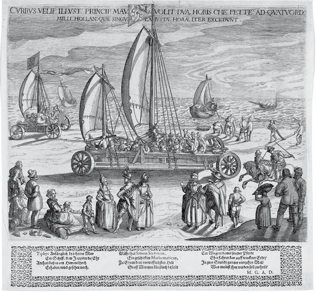 Hatte der Mensch je etwas Schnelleres erschaffen? Schnurgerade wie ein Pfeil sauste es über den Strand in Scheveningen an der Küste bei Den Haag und erreichte bis zu 40 Stundenkilometer. Ein Fahrgestell mit vier großen Wagenrädern trug den Rumpf, der 20 oder mehr tollkühnen Passagieren Platz bot. Der Wind in den breiten Rahsegeln an den beiden Masten trieb das Gefährt über den Sand voran, und als Statthalter Prinz Moritz, Zweitgeborener des ermordeten Königs Wilhelm des Schweigers, das Steuer übernahm, flatterte die Prinzenflagge des Hauses Oranien am Mast. Bei kräftiger Brise schoss der zeilwagen (Segelwagen) am Strand entlang, scheuchte die Möwen auf und legte ein Tempo wie der Wind vor, sodass die Passagiere keinen Fahrtwind mehr auf ihren Gesichtern spürten, wie ein französischer Augenzeuge 1606 berichtete.1