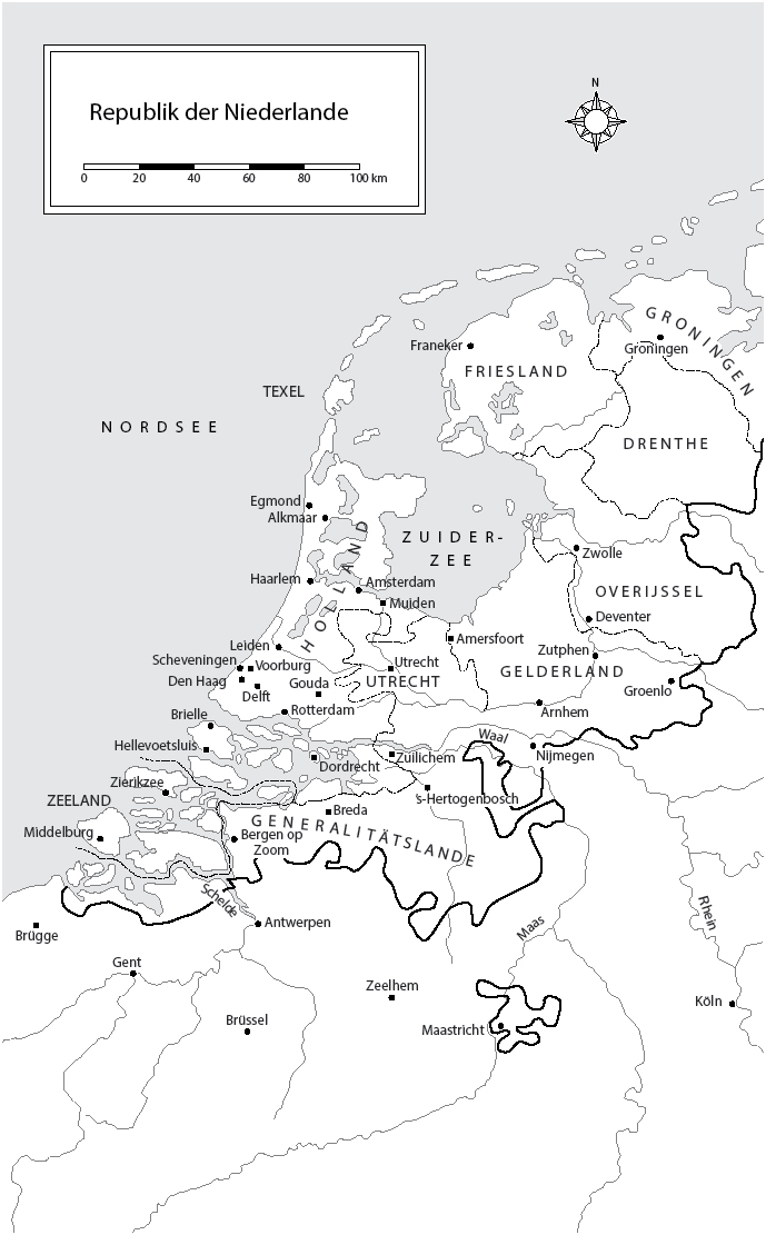 Dann schweift der Blick umher. Was sind diese Niederlande? Woraus bestehen sie? Aus Wasser. So viel Wasser, flache zeeën und meeren, manchmal spiegelnd, manchmal dunkel, wenn der Wind darüberfährt. Das Licht ist immer ein anderes. Platte Felder mit Gräben und Deichen bis an den niedrigen Horizont, hier und da vielleicht ein paar Baumgruppen, die sich in der Brise ducken. Ausgewaschene Küsten, offenes Heideland, blanke Städte und Dörfer, von ferne an ihren Kirchtürmen erkennbar.