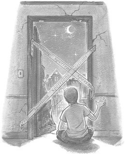 Bis um Mitternacht des Vortages seiner Ankunft blieb die Szenerie anschließend unberührt. Dann jedoch stieg ein fünfzehnjähriger Junge über das gelbe Band hinweg und setzte sich in einen Türrahmen, der nun ins Nichts führte. Er hatte tiefe Ringe unter den Augen, und das Herz war ihm schwer; so vornübergebeugt, wie er dahockte, schien es, als lastete das Gewicht der gesamten Welt auf seinen Schultern. Tief in Gedanken versunken, starrte er durch das klaffende Loch hinüber zu den fernen Gebäuden im Stadtkern von Willow Crest.