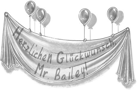Bewunderer aller Altersgruppen waren in die Buchhandlung geströmt, um ihren Lieblingsautor einmal hautnah und höchstpersönlich zu erleben. Unruhig traten sie nun von einem Fuß auf den anderen oder rutschten auf ihren Plätzen hin und her, während sie darauf warteten, dass er sich zum ersten Mal seit Jahren wieder in der Öffentlichkeit zeigte. Anlass des Festakts war nicht nur seine beachtliche, nun fünf Jahrzehnte umspannende Schriftstellerkarriere; vielmehr waren die Gäste auch an einem ganz besonderen Tag im Leben des Autors zusammengekommen: Auf einem farbenfrohen Banner, gemalt von Schülern der örtlichen Grundschule, das sich quer über die Bühne spannte, stand ALLES GUTE ZUM 80. GEBURTSTAG, MR. BAILEY!