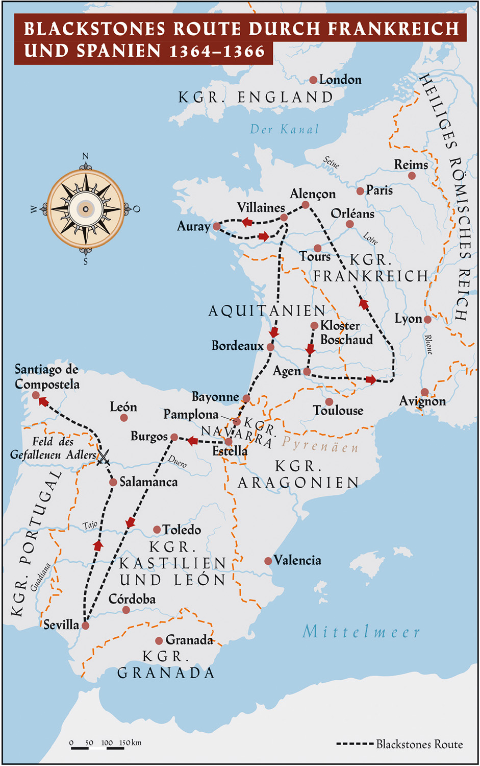 Der Prinz beugte sich vor und zeigte auf Spanien. Auf der Karte waren die verschiedenen Regionen eingezeichnet, darunter auch das kleine, aber strategisch wichtige Königreich Navarra, eingezwängt zwischen dem Meer und dem Königreich Aragonien im Osten sowie dem größeren Königreich Kastilien im Süden. In Navarra lebten weniger als hunderttausend Seelen, doch seine schmale Grenze zu Aquitanien, dem Herzogtum des Prinzen, bot dem ehrgeizigen Pyrenäenkönig ein Einfallstor nordwärts nach Frankreich.