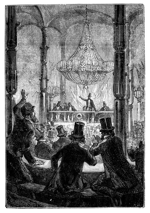 Als die Uhr im großen Saal acht schlug, dass es wie Salutschüsse krachte, schnellte Impey Barbicane, wie von einer Sprungfeder getrieben, hoch. Sofort kehrte Ruhe ein, und er begann mit großem Nachdruck zu sprechen.