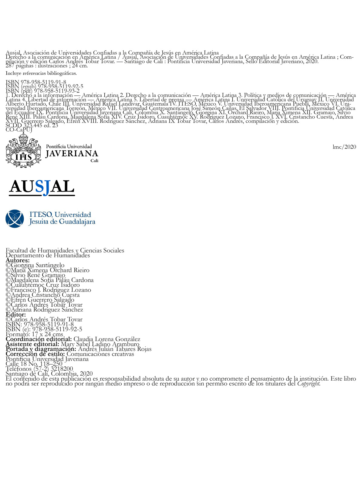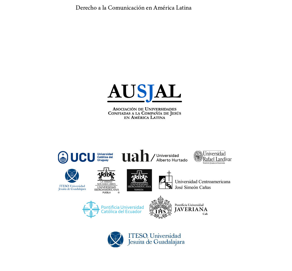 La consolidación de este proyecto editorial se fundamentó en la necesidad de generar una experiencia académica para el mutuo conocimiento de las trayectorias en investigación y la aproximación particular a los casos relativos al derecho a la comunicación en América Latina por parte de los homólogos AUSJAL. De esta forma, en la escritura de este manuscrito participaron profesores y profesoras de la Universidad Iberoamericana (México), la Universidad Iberoamericana Puebla (México), la Universidad Iberoamericana Torreón (México), el Instituto Tecnológico y de Estudios Superiores de Occidente-ITESO (México), la Universidad Rafael Landívar (Guatemala), la Universidad Centroamericana José Simeón Cañas (El Salvador), la Pontificia Universidad Católica del Ecuador, la Universidad Alberto Hurtado (Chile), la Universidad Católica del Uruguay, y la Pontificia Universidad Javeriana Cali (Colombia).