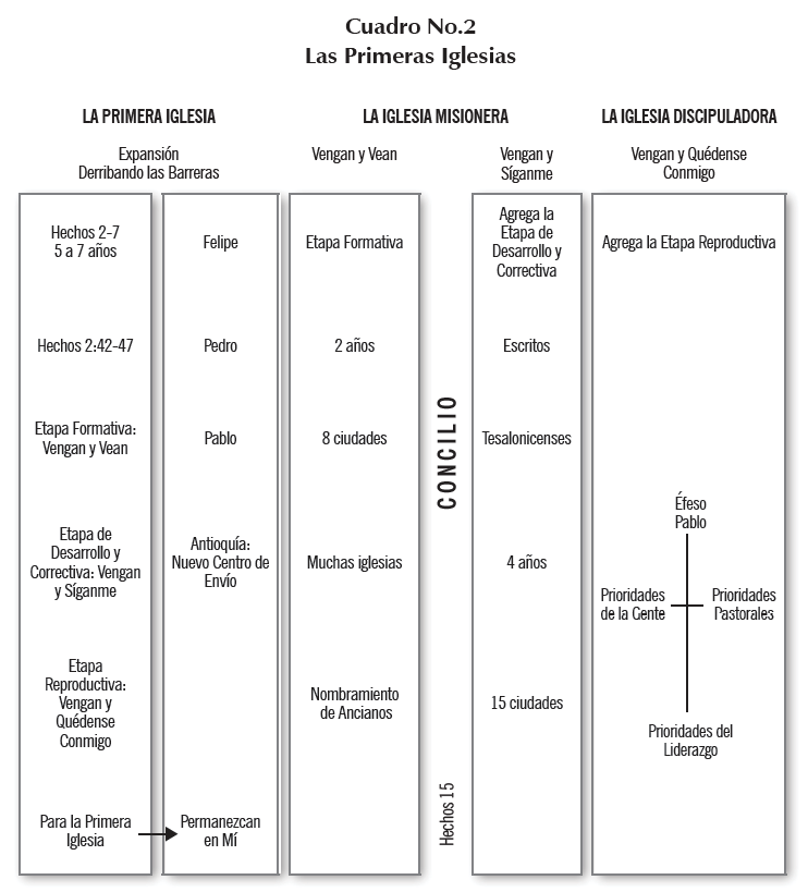 Por las clases de iglesias que formaron los apóstoles, sabemos que ellos hicieron discípulos. Miremos los tres ejemplos dominantes en Hechos y en las Cartas: La primera iglesia, en Jerusalén; la iglesia misionera, un conglomerado de congregaciones que Pablo plantó en sus primeros dos viajes misioneros; y la iglesia discipuladora, fundada en Éfeso (vea el Cuadro No.2). Los principios de los apóstoles fueron establecidos en la primera iglesia, expandidos en la iglesia misionera y madurados en la iglesia discipuladora.