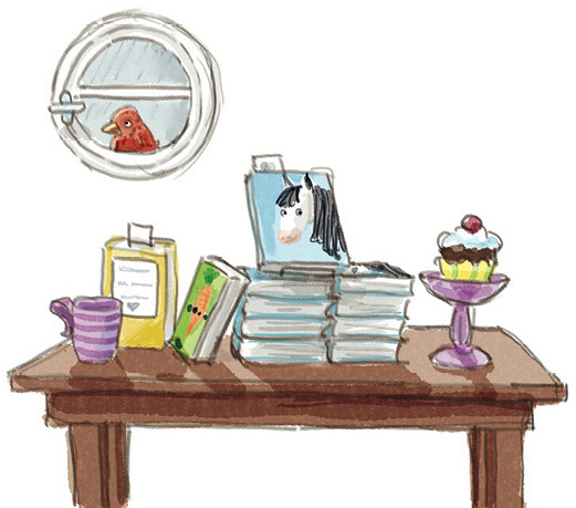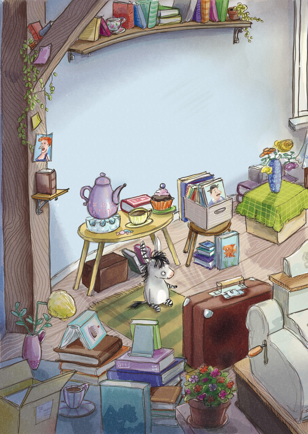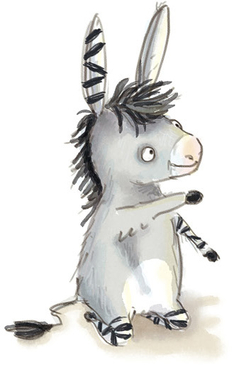 Grimm legte den Löffel beiseite, um nachzusehen. Auf dem Leseteppich vor der Kasse hockte ein sehr kleiner Esel. Oder war es ein Zebra? Mit großen Augen schaute der seltsame Besucher zu ihm auf. Ein fleckiger Koffer stand neben ihm.