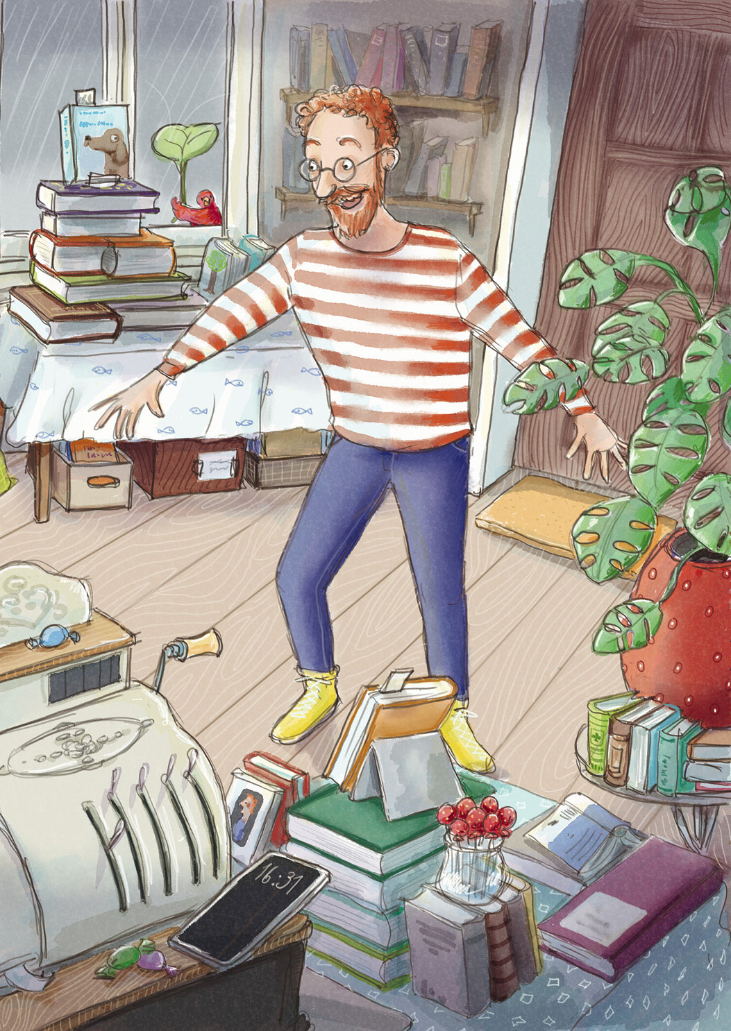 Er legte den Stift beiseite und trat ans Schaufenster. In den Regalen um ihn herum standen und lagen Bücher. Auch neben der Kasse und auf dem kleinen, goldenen Tischchen in der Ecke, ja selbst auf dem Fußboden stapelten sie sich. Es waren so viele, dass selbst der längste Regentag nicht gereicht hätte, um sie alle zu lesen.