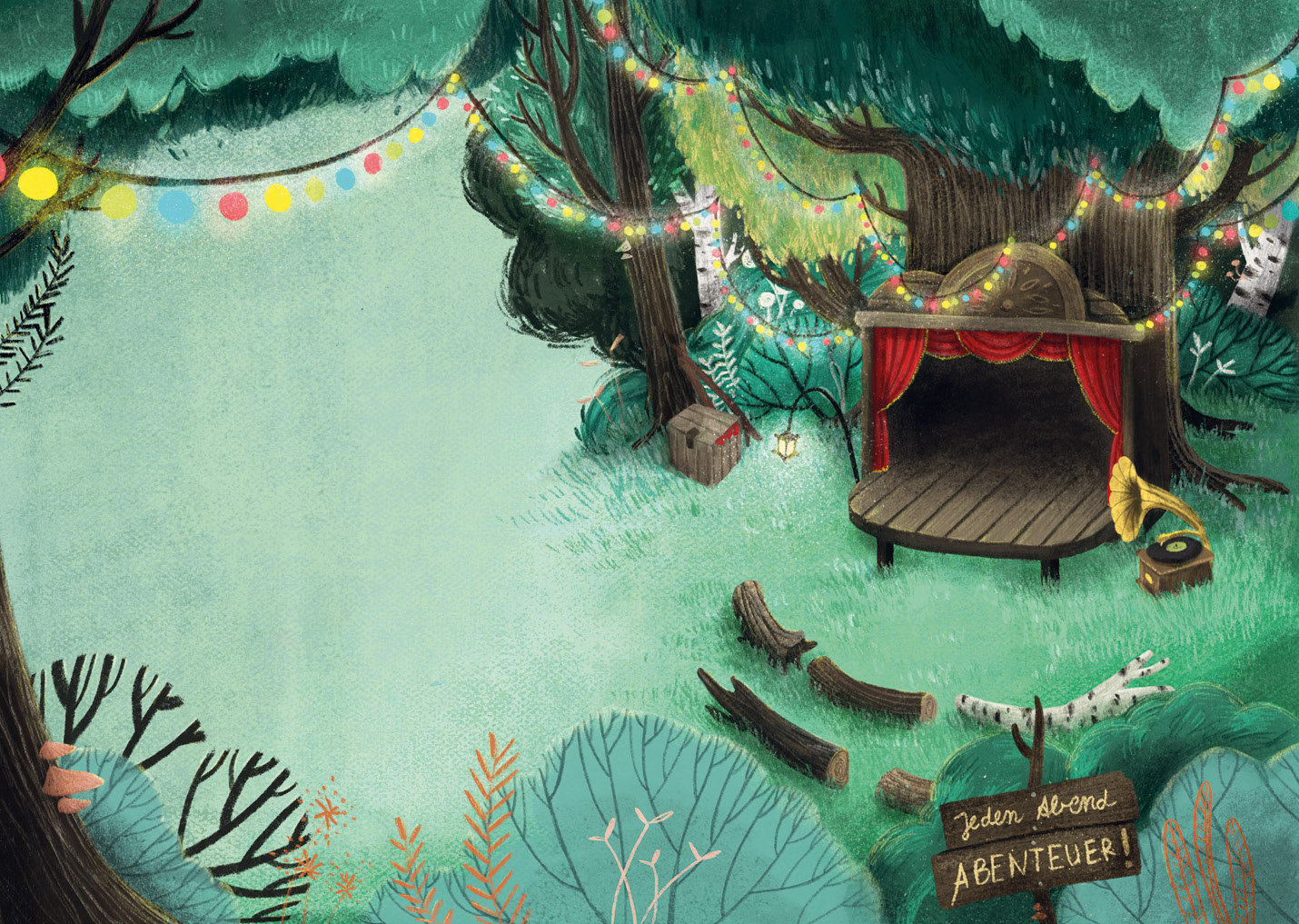 Zara kletterte geschickt die Rinde einer Buche empor und sprang, hüpfte und kletterte fast lautlos von Baum zu Baum, bis sie schließlich die Lichtung erreichte. Auf dem Ast einer Kiefer hielt sie inne. Von hier aus hatte sie einen perfekten Blick auf die kleine Bühne, die nur wenige Meter von ihr entfernt seelenruhig dastand, so als hätte es sie schon immer gegeben. Neben der Bühne prangte ein Schild. Was war da zu lesen? Zara kniff die Augen zusammen. »Jeden Abend Abenteuer!«, stand dort in einer verschnörkelten Schrift. Was hatte das zu bedeuten?