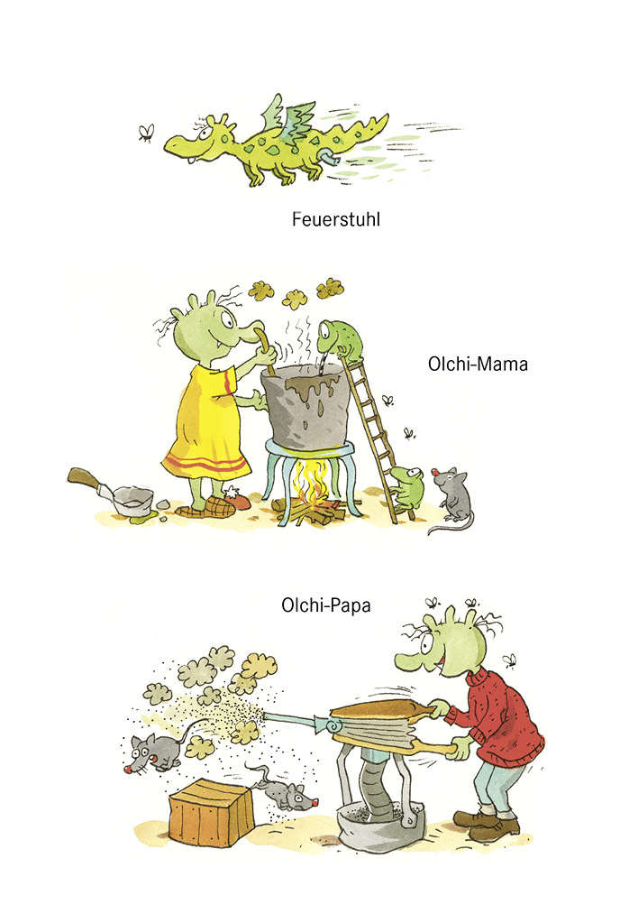 Olchi-Oma war drüben an der Garage zugange. Sie rieb den Drachen Feuerstuhl mit Schlamm ein. Er war in den Gewitterregen gekommen, jetzt war er viel zu sauber und sollte endlich wieder schön olchig aussehen.