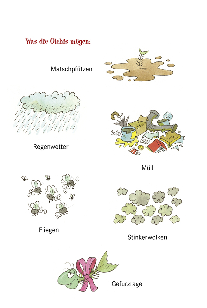 Olchi-Mama pustete lächelnd zwei freche Fliegen von ihrer Dose und nahm noch einen Schluck Brühe. Ein warmes, fein fauliges Lüftchen lag über dem Müllberg. Olchi-Mama bekam richtig Appetit davon und überlegte, was sie heute kochen könnte.