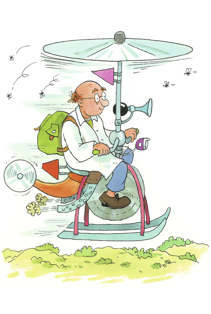 Schwitzend trat er in die Pedale und brachte dadurch einen Propeller in Schwung, der sich oben an einer Stange drehte. Ein bisschen verkrampft hielt er sich am Lenker fest.