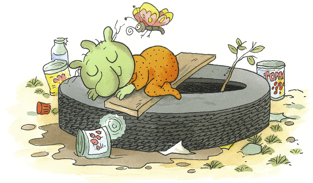 Das Olchi-Baby schlief auf einem Autoreifen im Schatten der Höhle. Lautlos kam ein gelber Schmetterling herangeflattert und landete auf seiner kleinen Knubbelnase. Das Olchi-Baby merkte nichts davon, so tief lag es im schönsten Schlummer.