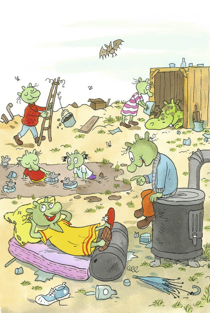 Letzte Nacht hatte es gewittert, und zum ersten Mal seit langer Zeit gab es wieder krötige Pfützen auf dem Müllberg. Jetzt spielten sie in einer von ihnen mit den Ratten Schiffe versenken.