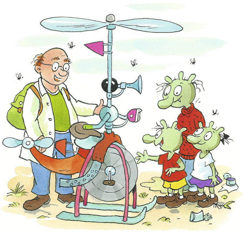 »Hallo Olchis!«, rief Professor Brausewein und landete direkt neben der Olchi-Höhle. »Puh! Ist das heiß heute!«