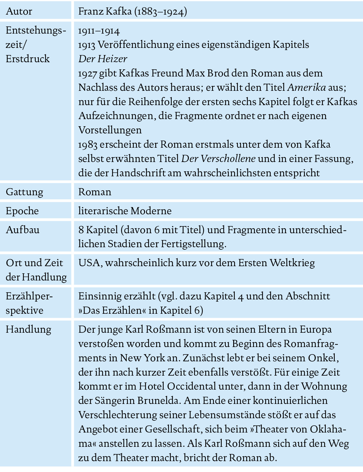 Der Verschollene ist Kafkas frühestes EntstehungRomanprojekt, dessen Ergebnisse erhalten sind. Lediglich das erste Kapitel hat der Autor zur Veröffentlichung freigegeben. Davor und danach geschriebene Teile des Gesamtwerkes sind entweder vernichtet, im Manuskript erhalten oder, das ist wahrscheinlich die kleinste Gruppe von Texten, veröffentlicht. Nach Kafkas Tod erschien das Romanfragment im Zusammenhang, unter dem Titel Amerika nach damaligen Editionsgewohnheiten herausgegeben von Kafkas Freund und Nachlassverwalter Max Brod. Erst seit 1983 liegt der Roman in einer Fassung vor, die dem Zustand der Handschrift und damit der Vorstellung des Autors zumindest sehr nahekommt. Sie ist auch die Textgrundlage für den vorliegenden Lektüreschlüssel.