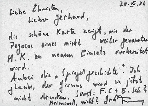 Anbei die »Spiegelgeschichte«. Ich glaube, der Girnus wird sie jetzt nicht drucken. Sonst: F. C + E. Sch?