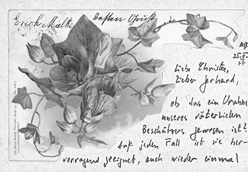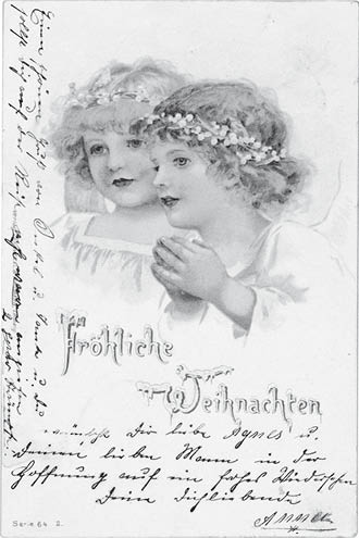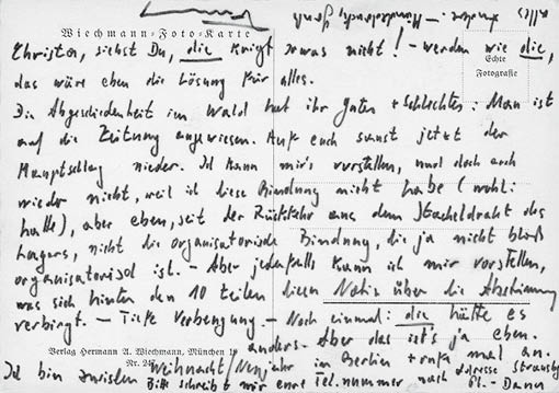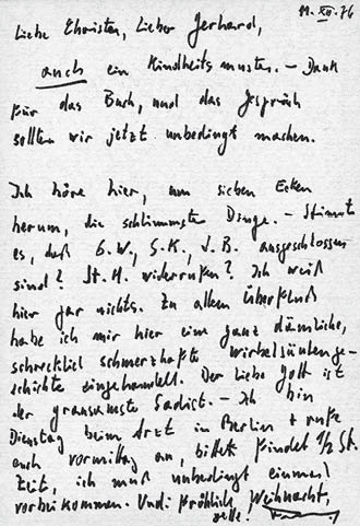 Ich höre hier, um sieben Ecken herum, die schlimmsten Dinge. – Stimmt es, daß G. W., S. K., J. B. ausgeschlossen sind? St. H. widerrufen? Ich weiß hier gar nichts. Zu allem Überfluß habe ich mir hier eine ganz dämliche, schrecklich schmerzhafte Wirbelsäulengeschichte eingehandelt. Der liebe Gott ist der grausamste Sadist. – Ich bin Dienstag beim Arzt in Berlin + rufe euch vormittag an, bitte findet 2 St. Zeit, ich muß unbedingt einmal vorbeikommen. Und: fröhliche Weihnacht, gelle!