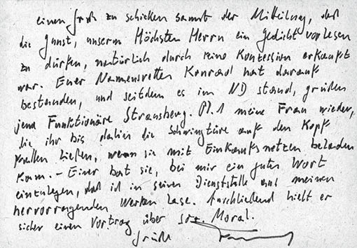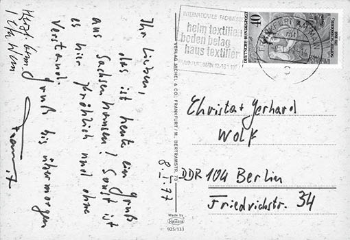 ob das ein Urahne unseres väterlichen Beschützers gewesen ist? Auf jeden Fall ist sie hervorragend geeignet, euch wieder einmal einen Gruß zu schicken samt der Mitteilung, daß die Gunst, unserm Höchsten Herrn ein Gedicht vorlesen zu dürfen, natürlich durch keine Konzession erkauft war. Euer Namensvetter Konrad hat darauf bestanden, und seitdem es im ND stand, grüßen jene Funktionäre Strausberg. Pl. 1 meine Frau wieder, die ihr bis dahin die Schwingtüre auf den Kopf fallen ließen, wenn sie mit Einkaufsnetzen beladen kam. – Einer bat sie, bei mir ein gutes Wort einzulegen, daß ich in seiner Dienststelle aus meinen hervorragenden Werken lese. Anschließend hielt er sicher einen Vortrag über soz. Moral.