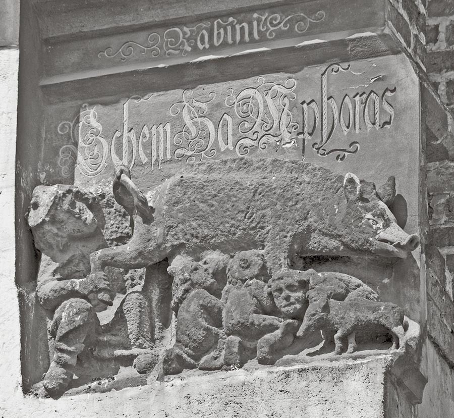 Aber ich hatte nicht erwartet, was dann geschah. Ich dachte an meinen Vater und daran, was es für ihn bedeutet hatte, Geistlicher zu sein, und als ich die Stufen zur Kanzel hinaufstieg, konnte ich den Druck, der mit dem Predigen auf ihm gelastet hatte, auf neue Weise nachempfinden. Zu meiner Überraschung konnte ich aber auch nicht aufhören, über etwas anderes nachzudenken, nämlich über das an der Außenseite der Kirche angebrachte Figurenrelief der »Judensau«. Diese Skulptur aus dem 14. Jahrhundert ist oben am Kirchturm angebracht worden und blickt in eine Richtung, in der sich einmal das jüdische Viertel befunden haben muss. Zu Luthers Zeit hatten die Juden Wittenberg bereits verlassen, und für eine jüdische Gemeinschaft nach 1422 gibt es keine Zeugnisse.[2] Das Relief zeigt eine riesige Sau, an der Juden Milch saugen, während ein Rabbi dem Schwein unter den Schwanz schaut. Beschriftet ist es mit Schem Hamphoras, einem späteren Schriftzug in kunstvollen gotischen Lettern. Schem Hamphoras bezeichnet den unaussprechlichen Namen Gottes, Worte, die nach jüdischem Glauben nicht niedergeschrieben werden sollten. Es ist eine abscheuliche Beleidigung für Juden (die kein Schweinefleisch verzehren), und es ist blasphemisch.