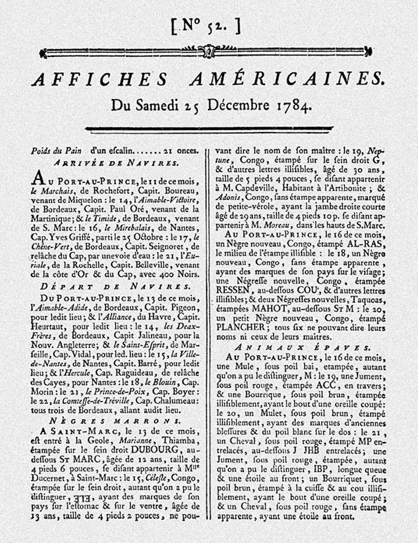 Die Affiches Américaines, die von 1764 bis 1790 wöchentlich in Cap und Port-au-Prince erschienen, enthielten Schiffsmeldungen, Nachrichten über das Geschehen in der Karibik und in Frankreich sowie an prominenter Stelle Steckbriefe von entlaufenen Sklaven mit genauen Beschreibungen, eingesandt von deren Besitzern.