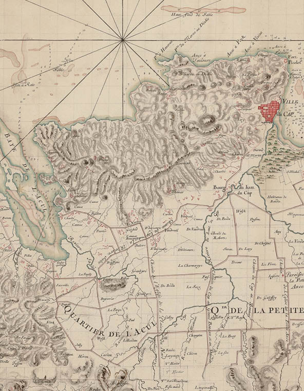 2. «Carte topographique du Nord de Saint-Domingue, 1760». Abgebildet ist die fruchtbare nördliche Hochebene von Saint-Domingue mit den größten und reichsten Plantagen der Kolonie. Direkt südlich vom Dorf Haut-du-Cap liegt die Bréda-Plantage, wo Toussaint geboren wurde und die ersten fünf Jahrzehnte seines Lebens vor der Revolution verbrachte.