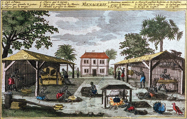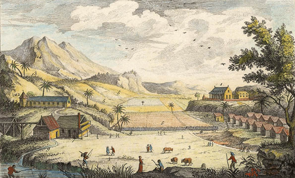 3. Zwei etwas idealisierte Darstellungen des Plantagenlebens auf der Kolonie. Oben: In der Mitte befinden sich die Zuckerrohrpflanzungen, links die Zuckerfabrik und -raffinerie, rechts die Sklavenhütten; die Villa des Plantagenbesitzers liegt hinten rechts. Unten: Die Verarbeitung von Tabak und Maniok durch Sklaven; in der Mitte hinten das Haus des Besitzers.