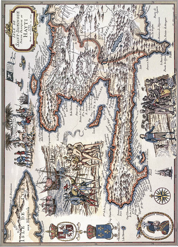 Ende des 18. Jahrhunderts bestand Saint-Domingue aus einem Territorium von rund 27.500 Quadratkilometern, die das westliche Drittel der Antillen-Insel Hispaniola ausmachten. Diese war nach der Entdeckung durch Christoph Kolumbus im Dezember 1492 zu spanischem Besitz erklärt worden. Von den Spaniern 1697 an Frankreich abgetreten, wurde die Kolonie in drei Provinzen aufgeteilt: Die bevölkerungsreichste nördliche beherbergte die Hauptstadt Cap Français, die in einer großen, geschützten Bucht lag und als erster Hafen von den Schiffen aus Europa und Amerika angelaufen wurde. Eine Reise von Frankreich aus dauerte etwa fünfundvierzig Tage, von der amerikanischen Ostküste zwanzig. Die Stadt war von einer weiten Tiefebene umgeben, dem fruchtbarsten Land in der Kolonie – auch dank regelmäßiger Niederschläge und der Bewässerung durch Flüsse und Bäche; Ende des 18. Jahrhunderts befanden sich hier die reichsten Plantagen der Kolonie.[17] Die beiden anderen Provinzen lagen im Westen und Süden, mit Port-au-Prince und Les Cayes als eigenen Hauptstädten. Port-au-Prince wurde 1750 zur Verwaltungshauptstadt und war umgeben von zwei Tiefebenen, dem Cul-de-Sac und der Artibonite, benannt nach dem größten Fluss des Landes. Ebenfalls in der westlichen Provinz lagen die wichtigen Häfen Gonaïves und Saint-Marc.[18] Die Urbanisierung hielt sich in der Kolonie in Grenzen; nur acht Prozent der Bevölkerung lebten in Städten mit mehr als eintausend Einwohnern,[19] und das schroffe Binnenland bestand hauptsächlich aus Gebirgszügen, tiefen Schluchten und hochgelegenen Karstebenen; die amerikanische Urbevölkerung von Hispaniola, die Taino, nannten die Insel «Ayti», das Land der hohen Berge. Von dichtem tropischem Urwald bewachsen, spärlich besiedelt und von Europäern kaum erforscht (weniger als ein Drittel der Kolonie war verlässlich kartiert), trennte dieses hohe Hinterland die drei Provinzen voneinander und schuf verschiedenartige Landschaften und regionale Klimazonen.[20] Es war schwierig, von einer Provinz zur anderen zu gelangen: Mitte des 18. Jahrhunderts wurde zwar eine Straße durch die Wildnis gebaut, die Cap und Port-au-Prince verbinden sollte, aber sie war erst ab 1787 für Kutschen befahrbar. In der Ebene gab es oft nur rudimentäre Verbindungen zwischen den kleineren Siedlungen und Pflanzungen, und die hochgelegenen Regionen waren ein weiteres Verkehrshindernis. Manche Straßen waren oft lange unpassierbar, wenn während der langen Regenzeit die Flüsse über die Ufer traten.[21] Der Süden – die kleinste der drei Provinzen – war besonders isoliert vom Rest der Kolonie und unterhielt in vielerlei Hinsicht engere Beziehungen zum benachbarten Jamaica, mit dem es einen lebhaften Handel mit Schmuggelwaren gab. Menschen und Waren reisten hauptsächlich auf dem Seeweg von einem Teil von Saint-Domingue zum anderen.[22]
