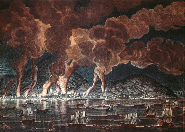 5. Zwei gegensätzliche Szenen aus den frühen Revolutionsjahren in Saint-Domingue und Frankreich: Der Brand von Cap am 21. Juni 1793 (oben) und eine Darstellung des französischen Parlaments im Februar 1794 (unten) nach dem Dekret vom 16. Pluviose, das die Sklaverei abschaffte; im Vordergrund jubeln emanzipierte schwarze Bürger, die vom Podium aus von einer angeblich über hundert Jahre alten schwarzen Frau beobachtet werden.