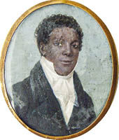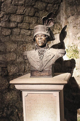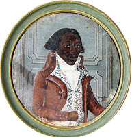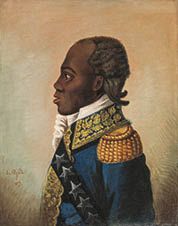 7. Drei Porträts, ursprünglich aus dem Besitz von Toussaints Nachkommen, zeigen wichtige Mitglieder der Familie Louverture: oben links Toussaints Stiefsohn Placide, oben rechts sein Sohn Isaac, unten links Isaacs Frau Louise Chancy, die Tochter von Toussaints Halbschwester Geneviève. Unten rechts ein Porträt Toussaints von 1877 von dem haitianischen Maler Louis Rigaud.