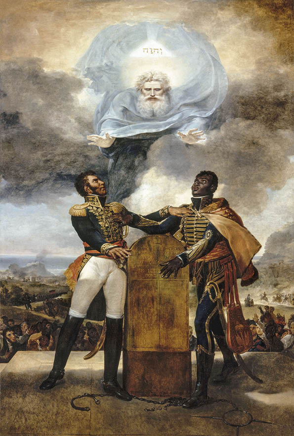 10. Guillaume Guillon-Lethière: Schwur auf die Ahnen (1822). Das Gemälde transportiert das haitianische Ideal nationaler Versöhnung nach der Unabhängigkeit durch die Allianz von schwarzen und mixed-race Bürgern, hier vertreten durch die Revolutionsführer Jean-Jacques Dessalines (links) und Alexandre Pétion (rechts).