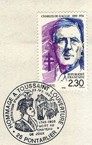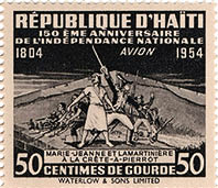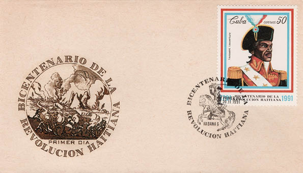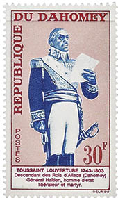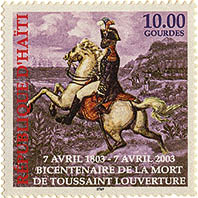 13. Es gibt viele Briefmarken zum Gedenken an Toussaint und die haitianischen Revolutionäre. Oben links: zum 150. Jubiläum der Revolution eine Darstellung von Lamartinière und seiner Frau Marie-Jeanne bei der Schlacht von Crête-à-Pierrot; Mitte: der 200. Todestag Toussaints 2003 und eine Briefmarke aus Dahomey (1963) sowie ein französischer Stempel (1991 neben Charles de Gaulle), die beide Toussaint als Befreier Haitis beschreiben; unten: kubanische Gedenkmarke und Stempel zur Zweihundertjahrfeier der Sklavenrevolte in Saint-Domingue von 1991.