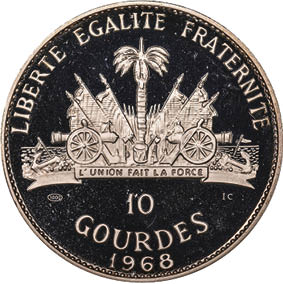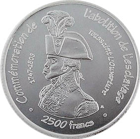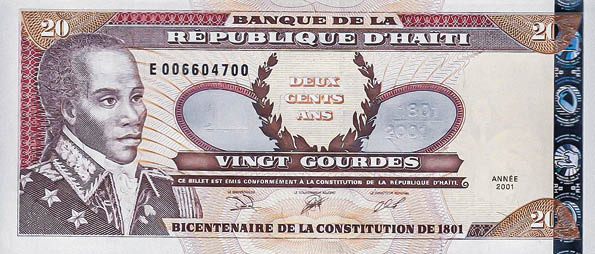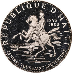14. Toussaints Konterfei findet sich regelmäßig auf Münzen und Geldscheinen, wie auf dieser haitianischen 10-gourdes-Silbermünze (1968, oben), die auf einem Gemälde von Gustave Alaux basiert, und der 20-gourdes-Note (2001, unten). 2007 wurde im Senegal zum 200. Jahrestag der Verfügung zur Beendigung des Sklavenhandels eine Münze geprägt (Mitte).