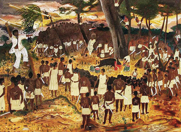 17. Vodou-Zeremonie in Bois-Caïman im August 1791, einer der Gründungsmythen der modernen Nation Haitis, dargestellt von der zeitgenössischen haitianischen Künstlerin Nicole Jean-Louis. Viele der Sklaven tragen Messer für den bevorstehenden Aufstand; die Narben auf ihren Rücken legen Zeugnis von der grausamen Behandlung durch ihre Besitzer ab. Links ist der Marron-Anführer Dutty Boukman zu sehen, der, weiß gekleidet und ein Buch in der Hand (daher sein Name), vor den versammelten Sklaven eine flammende Rede hält. In den Worten der Künstlerin: «Die Haitianer haben sich selbst aus der Sklaverei befreit, weil sie glauben, dass Gott uns alle gleich geschaffen hat.»
