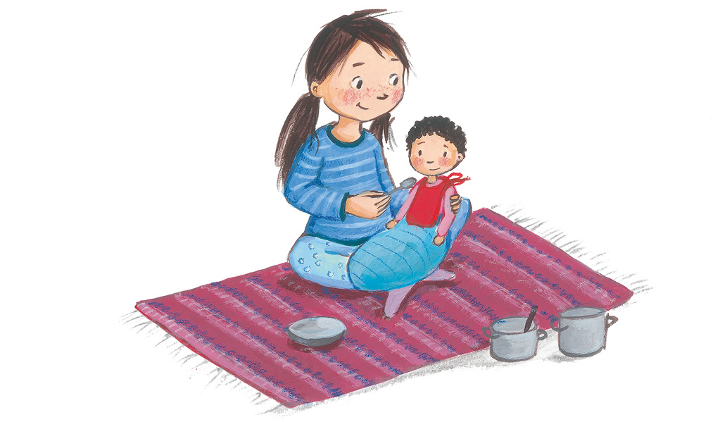 »Natürlich, Papa!« Sophia hockt auf dem bunten Flickenteppich vor ihrem Bett und hält Pia im Arm. Pia ist Sophias Lieblingspuppe. Sie hat schwarze Locken, ein Pausbackengesicht, und sie trägt ein rotes Lätzchen um den Hals.
