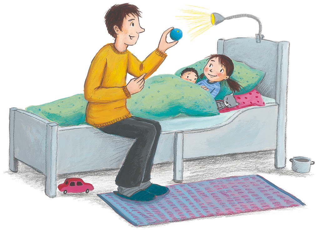 Papa dreht den Ball weiter und weiter, und Sophia kann gut erkennen, wie es deshalb abwechselnd Tag und Nacht wird.