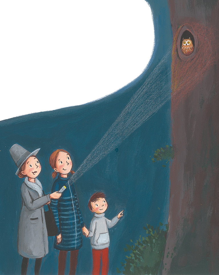 Anton schlüpft mit seiner Hand in die von Mama. Dann folgen sie Frieda den dunklen Parkweg entlang. Nach einer Weile bleibt Frieda stehen und zielt mit dem Strahl ihrer Lampe auf den Stamm einer mächtigen Buche. Anton kann oben im Baumstamm eine Höhle erkennen. Darin erscheint für einen winzigen Moment ein gelbes Augenpaar.